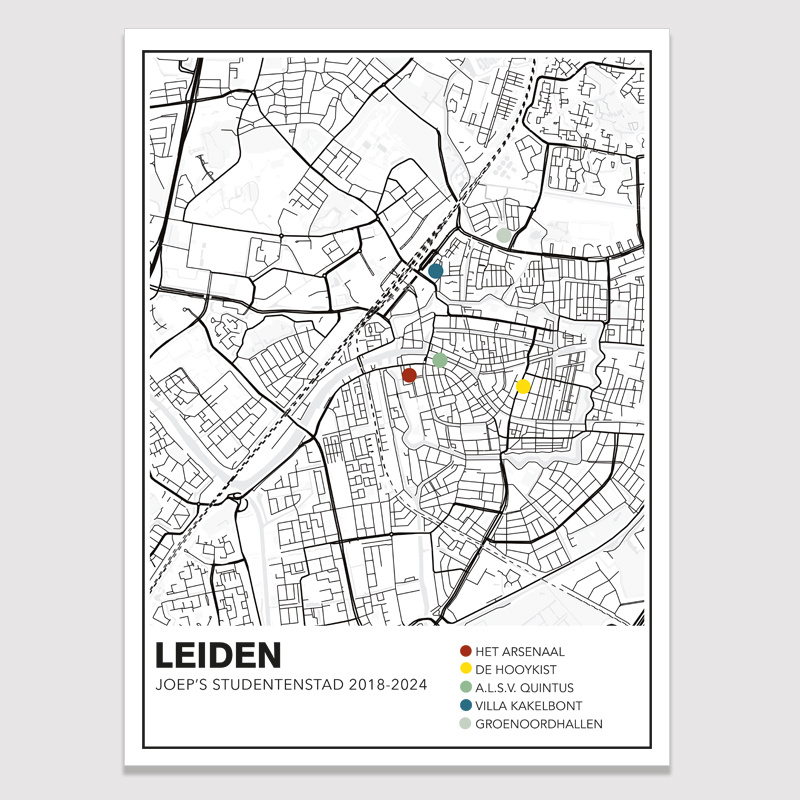 Denk bijvoorbeeld aan de (lagere en/of middelbare) school, de universiteit, de sportclub, het ouderlijk huis, het studentenhuis, de locatie van de bijbaan, de jaarclub, dat fijne park of de favoriete kroeg. Op deze poster kunnen we maximaal vijf speciale plekjes toevoegen. Wil je er meer? Stuur dan ajb een bericht naar info@postertime.nl om te overleggen wat mogelijk is. Zie je de poster al hangen op de studentenkamer?