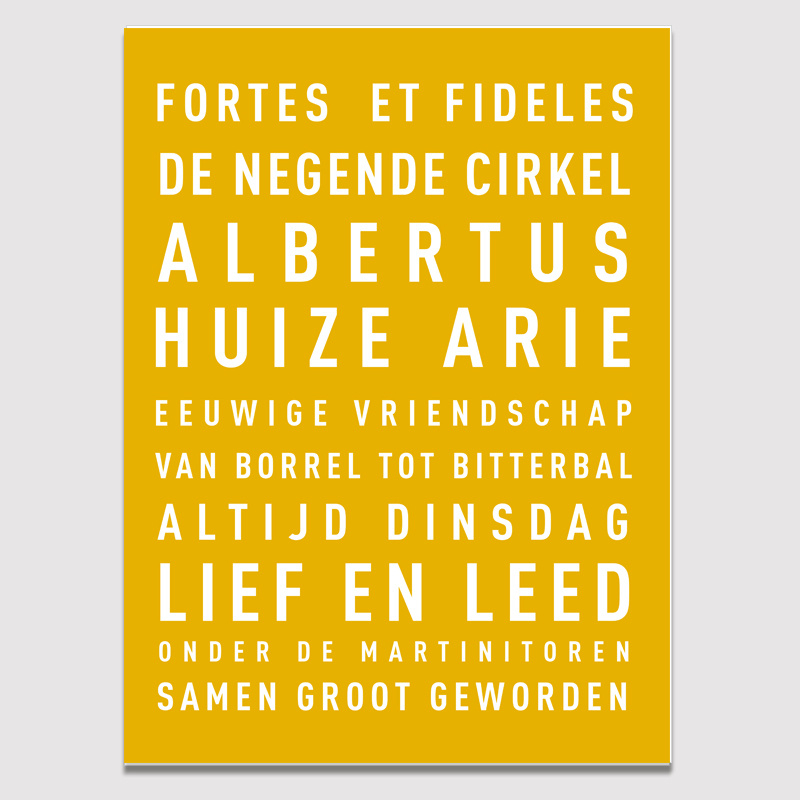 Afgestudeerd? Geslaagd? Een 21-diner? De verjaardag van iemand uit je jaarclub? Voor al die gelegenheden is het leuk om een persoonlijk cadeau te geven. Met een tekstposter die gebaseerd is op de ouderwetse trambanners uit Londen kun je de leukste dingen, gebeurtenissen, herinneringen en eigenschappen van het feestvarken kwijt. Leef je uit met creatieve teksten! Succes is verzekerd.